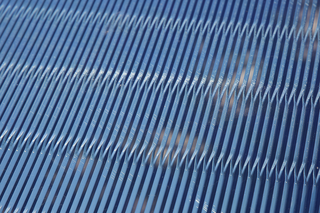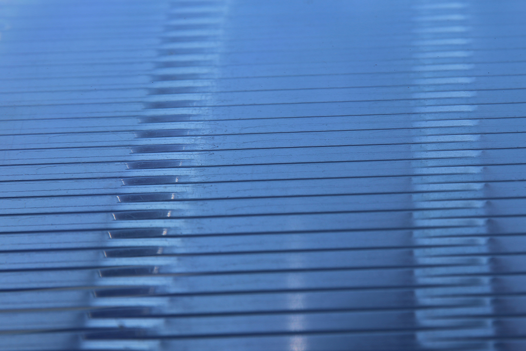航站楼顶层这2342块中空节能玻璃,内置超宽铝网,这些统一向北排列的铝网不仅可以遮挡阳光,同时又能满足航站楼的自然采光需求,节能环保。铝质遮阳网采用3系合金铝材料加工而成,均为异形铝网,整个幕墙玻璃项目中难度最大之处就在于此,仅仅超宽內置金属网中空玻璃的制作工序就非常繁复。